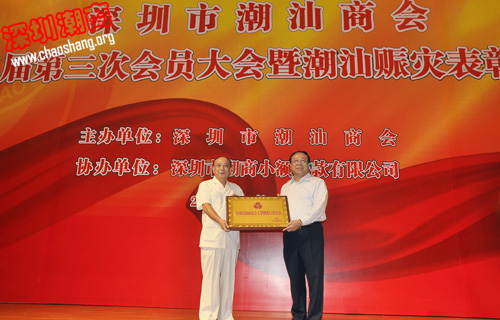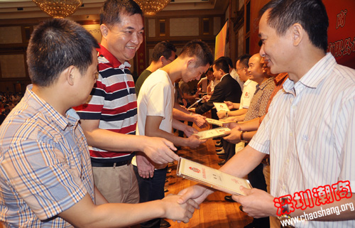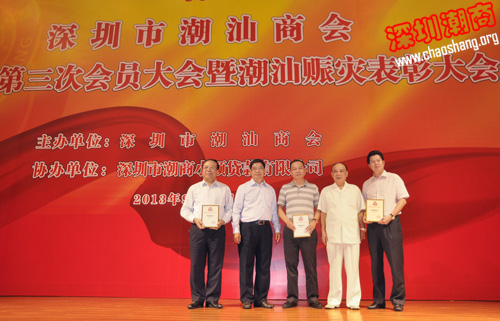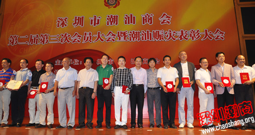 今年“8.17”潮汕发生了百年一遇的水灾,家乡遭受了很大损失,在深的潮人闻知后立刻开展了一场救援活动,涌现了可歌可泣的动人故事,为此我会与广东省潮商公益基金会联合表彰了此次赈灾的热心人士,共有18位荣获赈灾特别贡献奖,130位荣获赈灾贡献奖,348位荣获赈灾热心奖。荣誉会长庄礼祥、姚欣耀、李友烈、黄国祥、王再兴,名誉会长赵利生、黄锦良、王少主、李茂水等上台为他们颁奖。